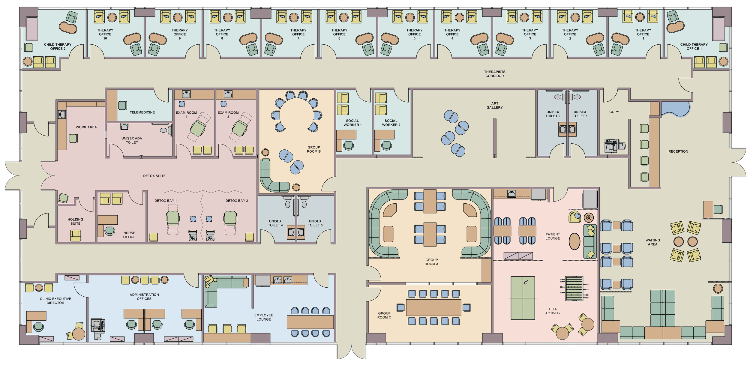 Rooted in the heart of Miami’s Allapattah neighborhood, VivaCare Allapattah provides accessible medical services that celebrate life, wellness, and cultural connection. Guided by psychiatry and environmental psychology, the clinic’s design prioritizes mental and emotional well being. Warm lighting, nature inspired palettes, culturally familiar motifs, and intuitive wayfinding create a sense of safety and calm that supports emotional regulation and healing for all ages. Aligned with Patient and Family Centered Care, VivaCare’s spaces encourage connection, privacy, and collaboration. Flexible group rooms and inclusive waiting areas empower patients and their loved ones to participate meaningfully in care. The result is a clinic that strengthens community bonds, respects cultural identity, and nurtures long term wellness through welcoming, restorative, human centered design. Inspired by the name “Viva,” meaning to live or long live, VivaCare Allapattah embodies vitality, resilience, and the joy of good health for every member of the community.